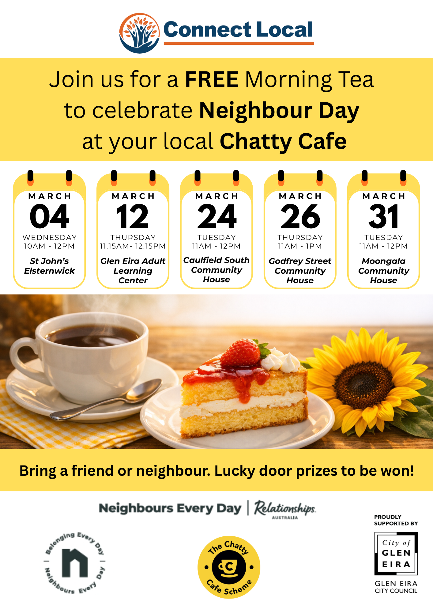 Neighbour Day is coming up, and once again Connect Local is proud to partner with our wonderful local Chatty Cafés to celebrate the power of connection, thanks to a community grant from Glen Eira Council.
